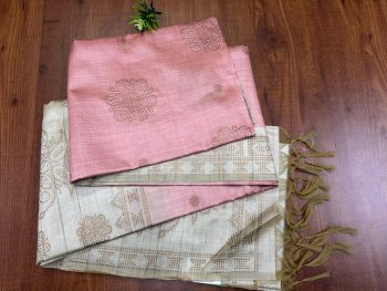 Wrap yourself in elegance with this Semi Tussar Saree. Crafted with a blend of traditional and contemporary design, this saree is perfect for any occasion. The soft texture and rich colors make it a versatile addition to your wardrobe. Elevate your style effortlessly with this timeless piece.